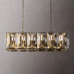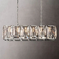 Inspired by the German chandeliers of the 1970s, our fixtures evoke the boldness and glamour of that era. Using a circle of faceted crystal glass prisms to reflect and refract light, the designer captures the essence of an emerald-cut diamond.