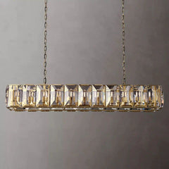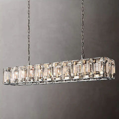 Inspired by the German chandeliers of the 1970s, our fixtures evoke the boldness and glamour of that era. Using a circle of faceted crystal glass prisms to reflect and refract light, the designer captures the essence of an emerald-cut diamond.