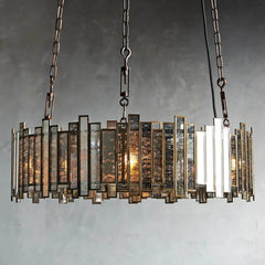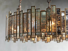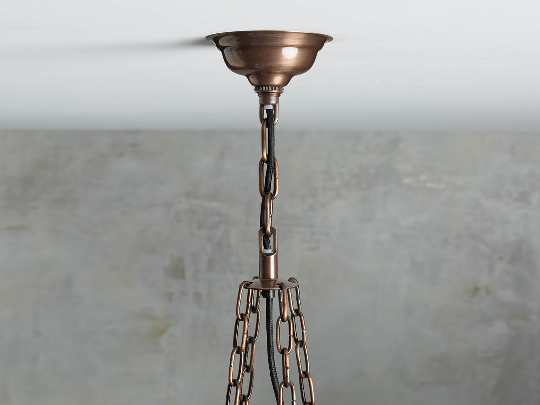 - Crafted from iron and brass with an Antique Copper finish with antiqued mirrored-glass panes surrounding the frame.