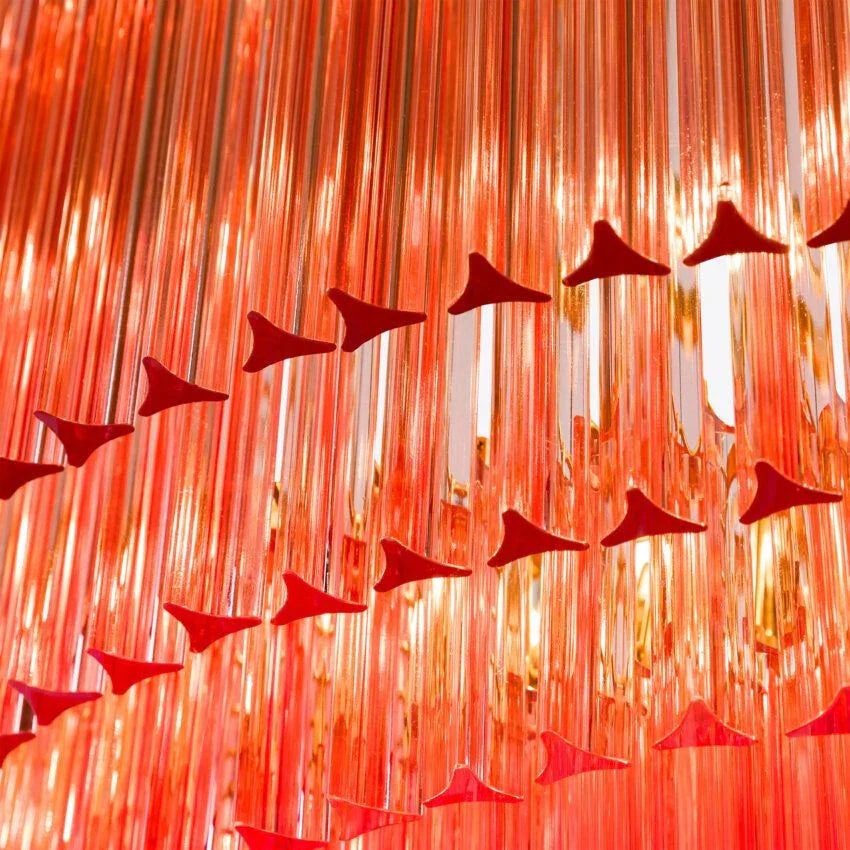 The Amaro chandeliers feature layers of mid-century inspired tri-style glass prisms, making them the ideal centerpiece for smaller spaces like living rooms, dining areas, or lobbies.