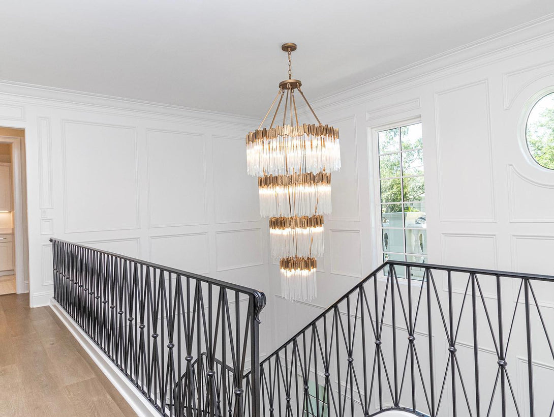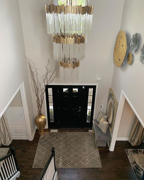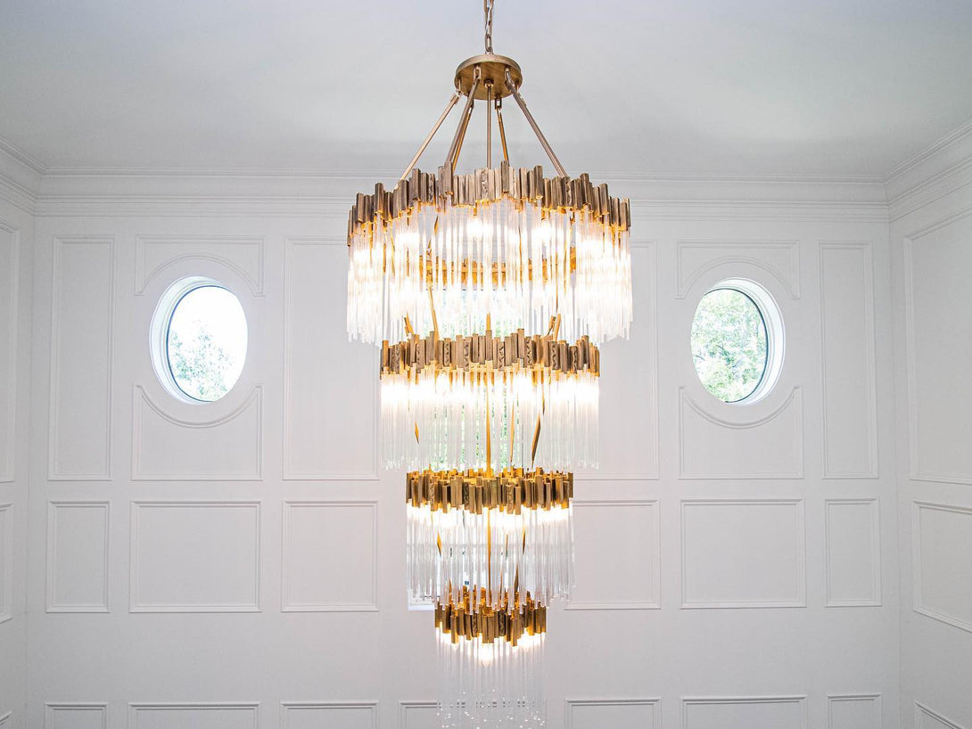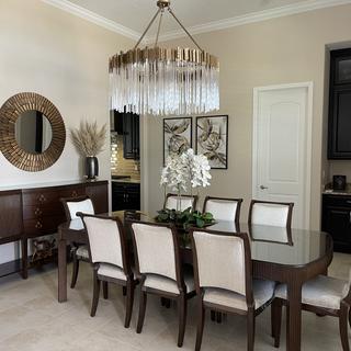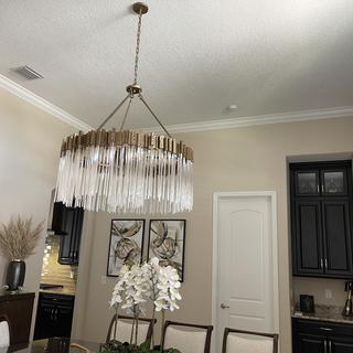 This chandelier features its round design trimmed with numerous crystal rods, which are well arranged in concentric circles, spreading and diffusing the illumination for a glam and wondrous effect. Besides, it metallic colored edging is in harmony with transparent glass. You will fall in love with this flush mount chandelier once you saw it online, or even more when installed in your large dining, living room, duplex, loft, villa.