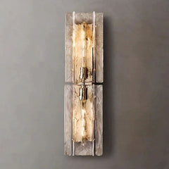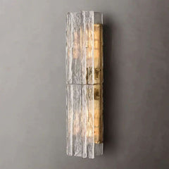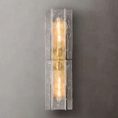 Crafted of solid cast glass, the collection's interlocking planes recall the geometric precision of the midcentury International Style. A study in repetition and rhythm, the linear form employs open space to lend a weightless feel. Gently rounded corners on the fluid, rippled panes subtly soften the outline, while diffused light glows from within.