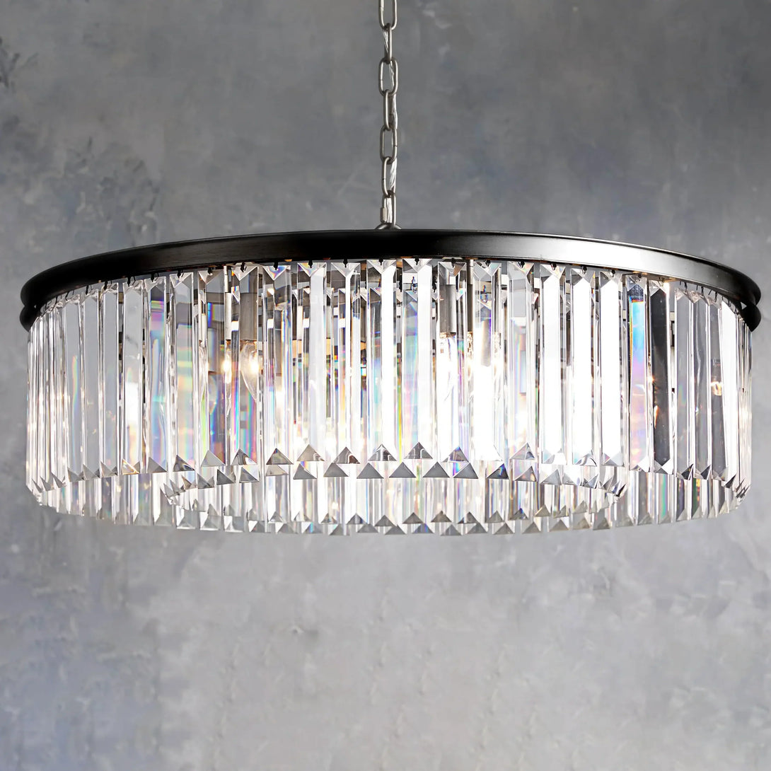- French Art Deco style of the 1920s is reborn in our glamorous Leyland Lighting Collection, featuring a row of faceted glass crystals hanging from a rustic iron frame.