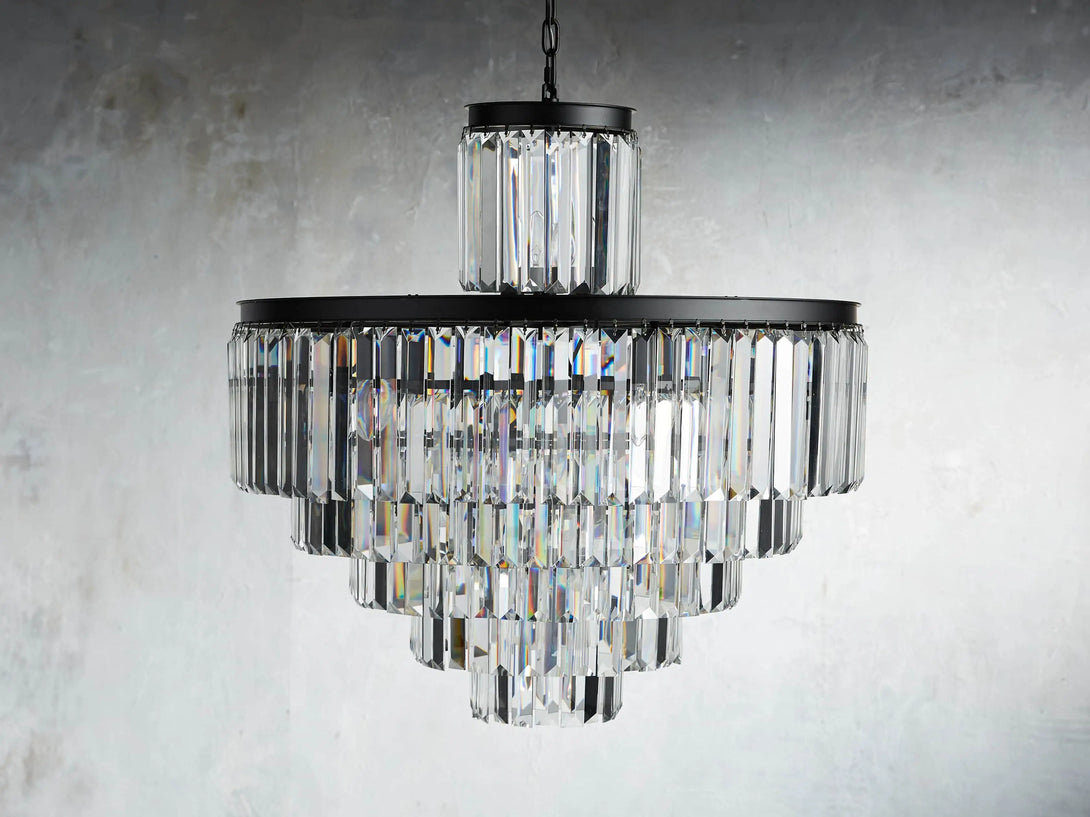 - French Art Deco style of the 1920s is reborn in our glamorous Leyland Lighting Collection, featuring layered rows of faceted glass prisms from a rustic iron frame.