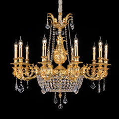 Featuring twelve enchanting candles gracefully supported by intricate brass arms, this chandelier exudes an aura of timeless elegance. Its captivating design is further accentuated by high-end crystals delicately suspended at the bottom, creating a mesmerizing play of light and adding a luxurious touch to your space.
