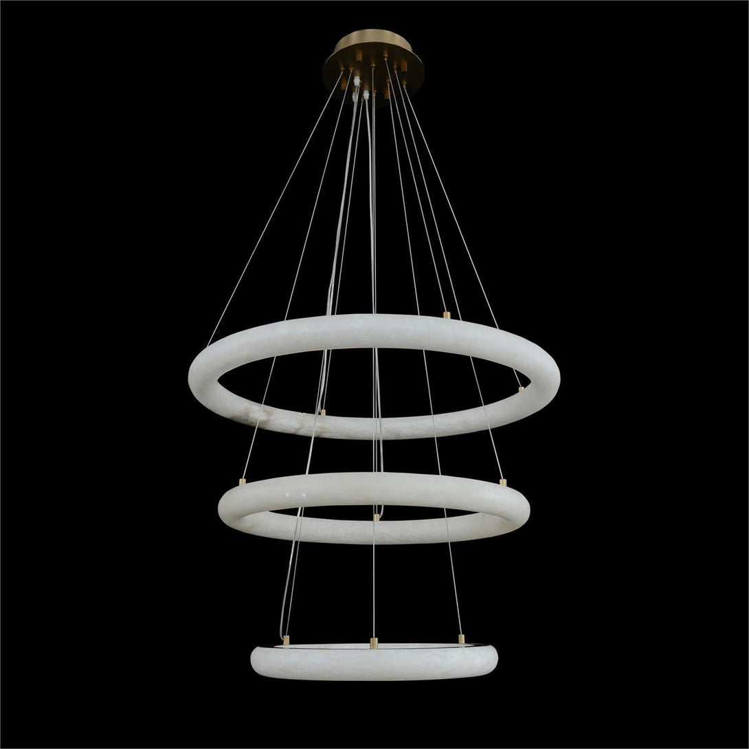 The Luca Three-Tier Pendant Chandelier is an elegant statement piece with three rings of natural alabaster stone suspended from a rounded canopy in an antique brass finish. The alabaster softly diffuses light, creating a warm ambient glow, while the integrated dimmer switch offers full control over illumination.