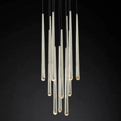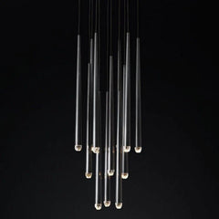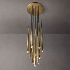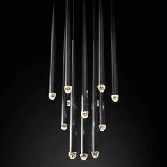 The main feature of the collection is a cluster of solid brass in the form of a suspension on a thin black cord. Recessed LEDs at the top of the faceted glass provide a warm light.