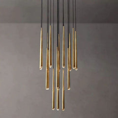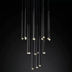 The main feature of the collection is a cluster of solid brass in the form of a suspension on a thin black cord. Recessed LEDs at the top of the faceted glass provide a warm light.