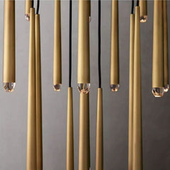 The main feature of the collection is a cluster of solid brass in the form of a suspension on a thin black cord. Recessed LEDs at the top of the faceted glass provide a warm light.