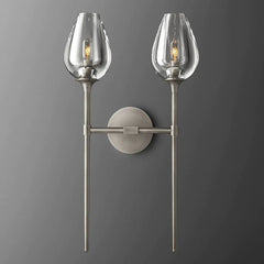 The form of a tulip in bloom inspired this collection. Lathe-carved from solid blocks of crystal and then hand polished, the glass torchieres' graduated thickness captures a petal's delicate contours while casting a warm, atmospheric glow. An understated brass armature secures the fluid forms, evoking stems fixing the ephemeral flowers in space.
