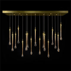 A statement chandelier featuring 22 illuminated crystal drops in gold leaf, each suspended at varying heights for a dramatic effect. Complementing the drops, nine integrated downlights in the canopy provide additional illumination. Perfect for grand dining spaces or entryways.