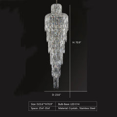 The whole light body is made of high-quality K9 crystal and stainless steel.This luxurious chandelier consists of multi-layer of crystal rods well arranged in circle form, showcasing the appreciation of orderliness. High-quality crystals as main material refract glistening and sparkling light for a dazzling and wondrous effect. Loops of regular circle, full of cool modern sense. Absutely a visual focal point as modern home decor. Extra long size, perfect for staircase, large living room, big hallway, hotel lobby, villas, duplex, or any high ceiling space.