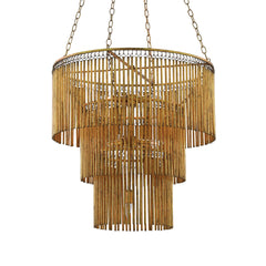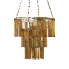 Create a stunning statement in your home with the Mantra Chandelier from Currey & Company. This elegant chandelier features a gold leaf finish on slender iron and brass rods, adding a touch of luxury to any room. With a tiered design and adjustable height, it's the perfect addition to a dining area or living room.