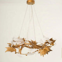Inspired by the majestic tree, Maple makes an eye-catching centerpiece in any living space. It consists of crystal and copper maple leaves, etched with intricate details to look like their natural counterparts. This leaf chandelier is expertly crafted from sturdy, anti-rust copper that is finished in a rustic golden-brown finish—its circular form means that it looks spectacular above a round dining table.