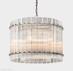 This crystal chandelier captures the period's fascination with geometric forms. Hundreds of faceted dynamic prisms subtly refract light, evoking the allure of the industrial age. Suspended like lush tassels on a welded iron frame, the angular crystal glass juxtaposes elegance and industrialism.