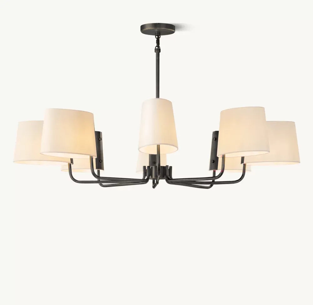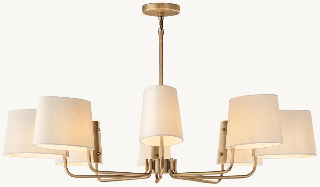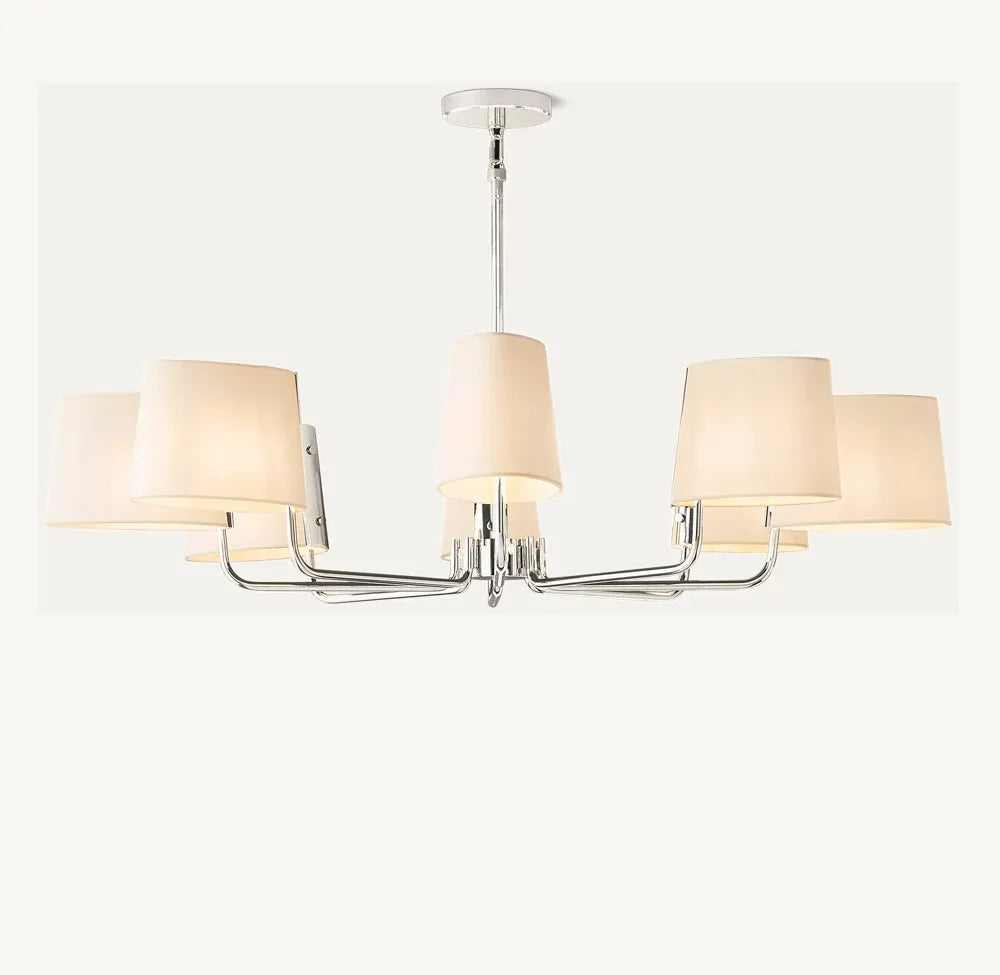 The exquisite chandelier is as elegant as a work of art, refracting soft light through the white linen shade, instantly enhancing the style and temperament of the space. The streamlined design of the chandelier intertwines with the light and shadow, as if quietly telling a story about elegance and light. Slender brass rods, echoing the simplicity of line drawings, arch gracefully to highlight oval linen shades. The result is a refined expression of Classicism.