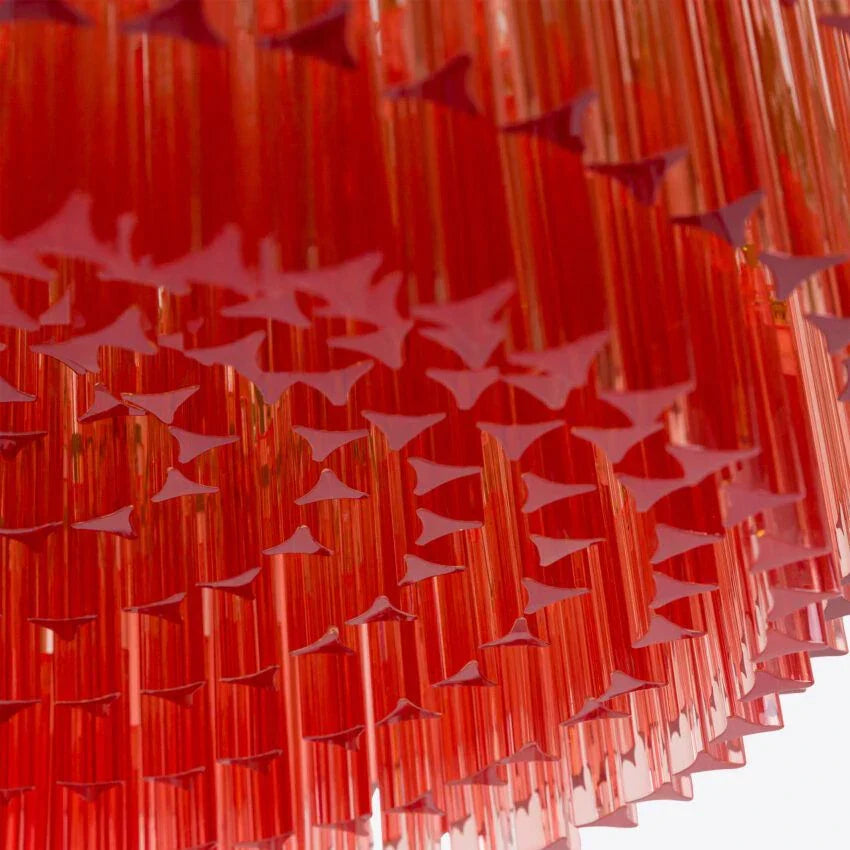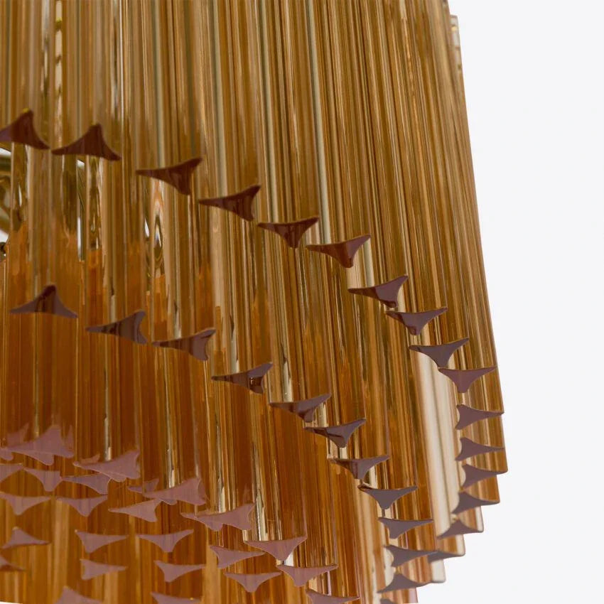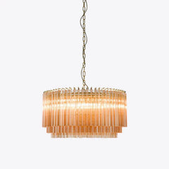 The Amaro chandeliers feature layers of mid-century inspired tri-style glass prisms, making them the ideal centerpiece for smaller spaces like living rooms, dining areas, or lobbies.