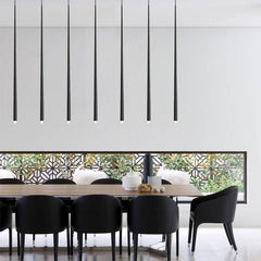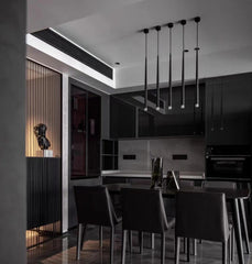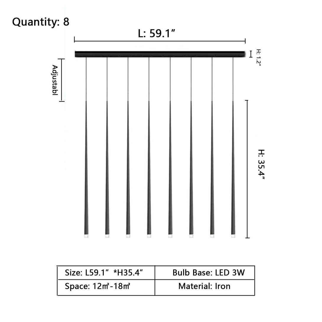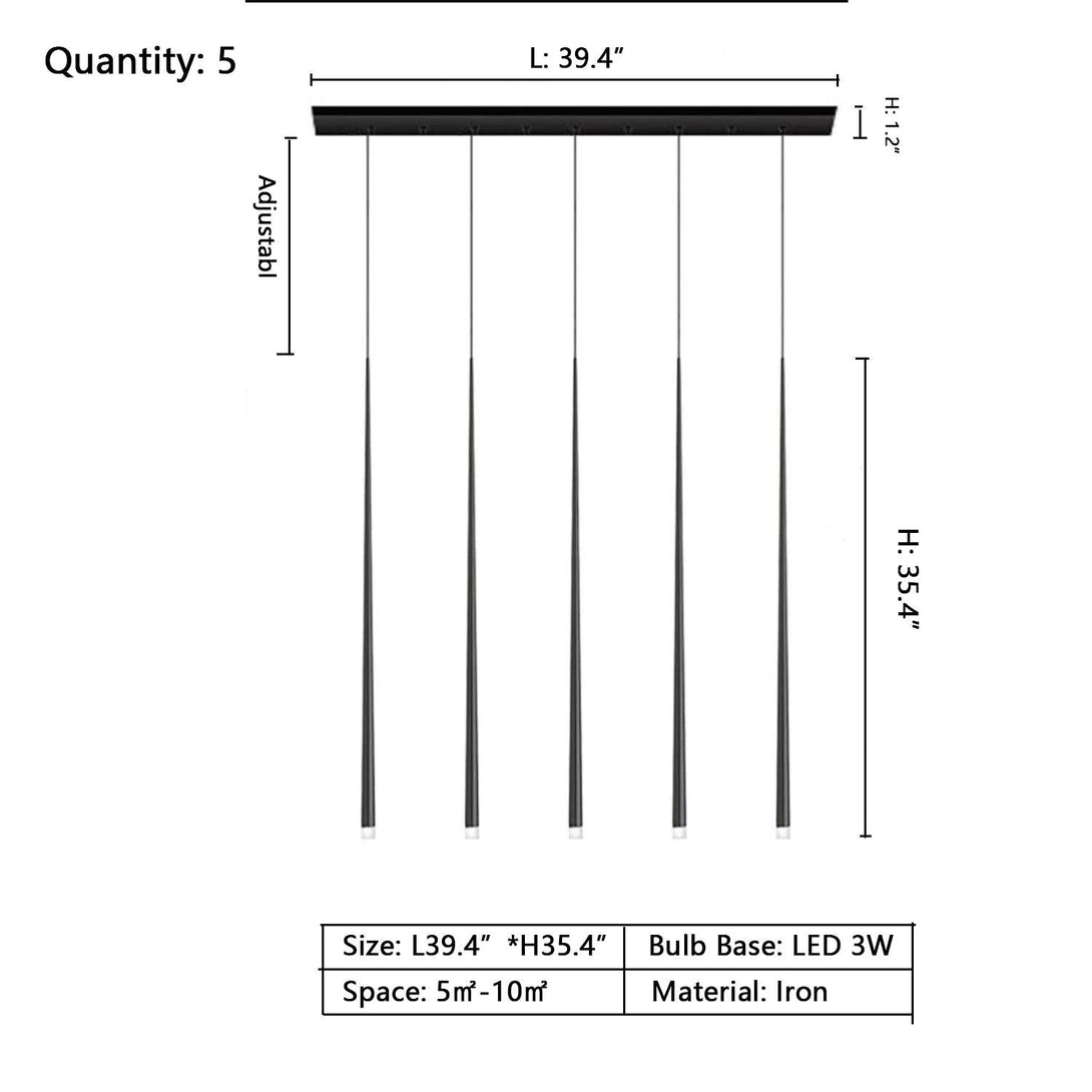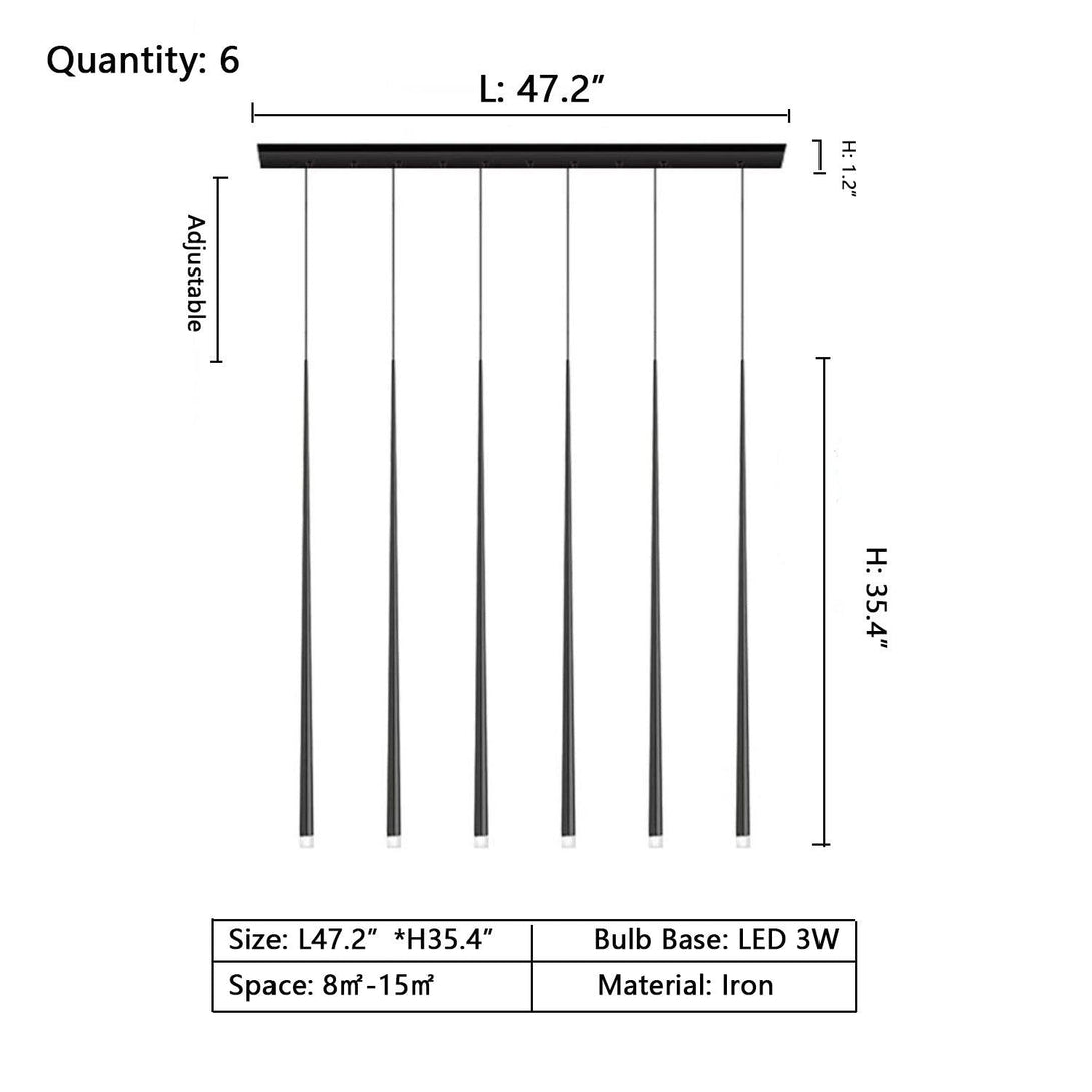 The body of this minimalist conical chandelier is made of iron, and the color of the body is made into a high-class black through the process of painting and frosting, which is anti-corrosion and rust-proof and durable. This chandelier is divided into a round chassis and a rectangular chassis, round chassis models for stairs or high floors of the living room, rectangular chassis can be used to decorate the dining room or set in the bed for night lighting.