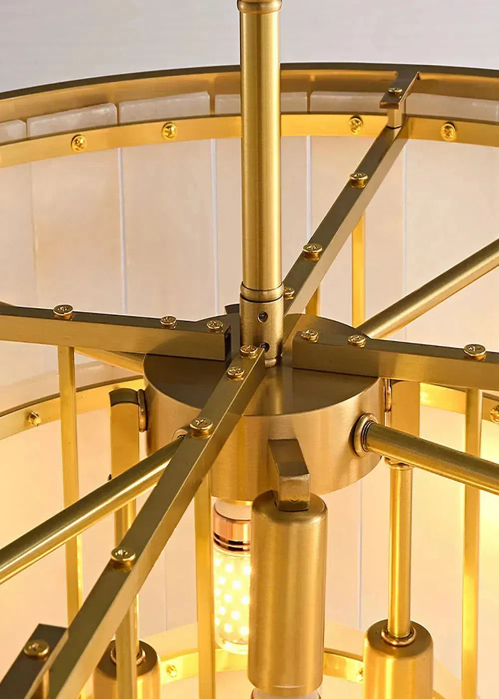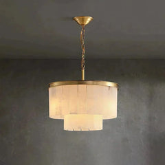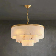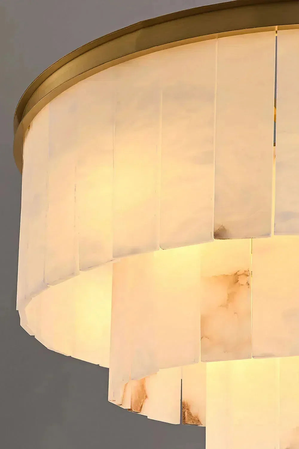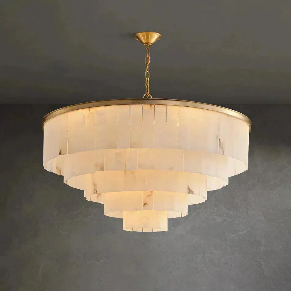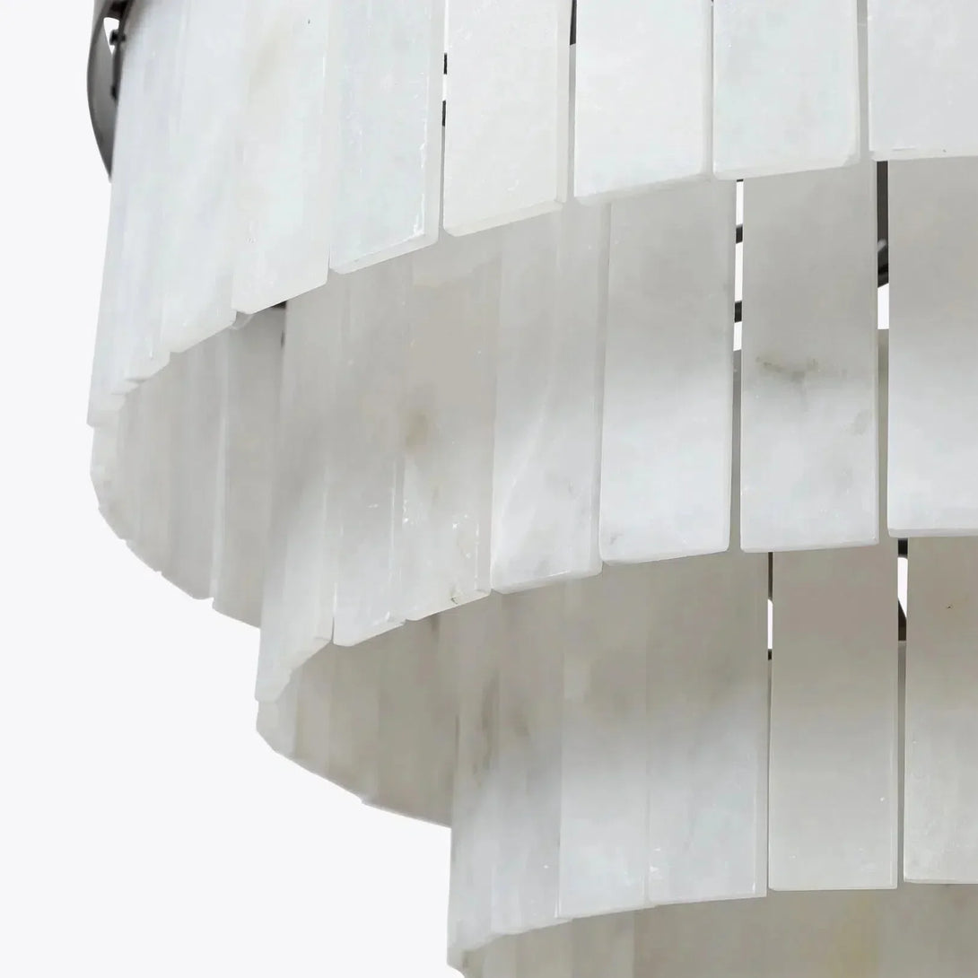 Enjoy the stunning beauty of nature with our modern marble layered chandelier. This exquisite lighting collection showcases layered marble suspended from a copper frame designed to capture and reflect light in the most elegant way. This chandelier adds a luxurious ambiance to any space.
