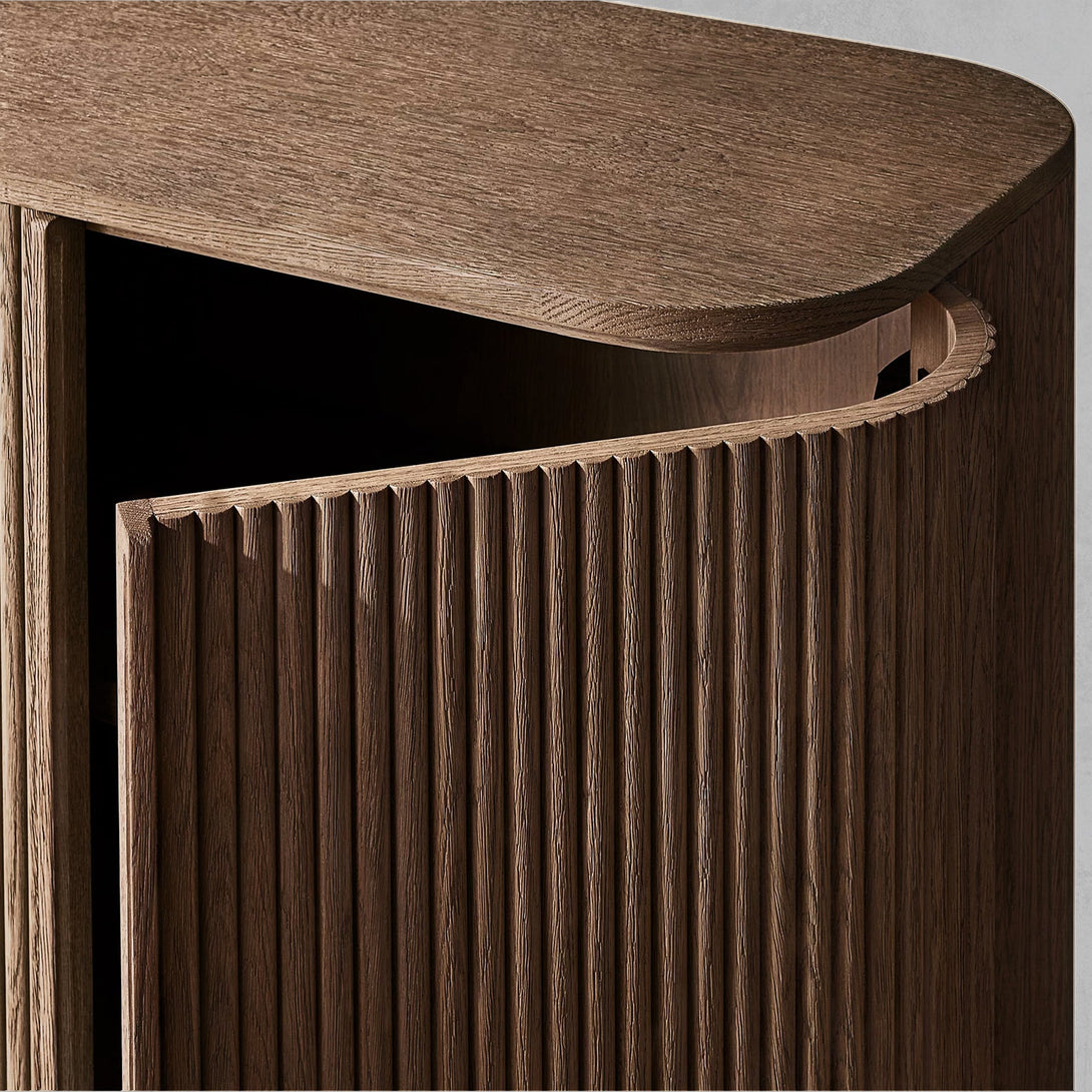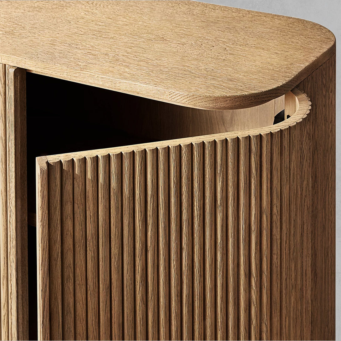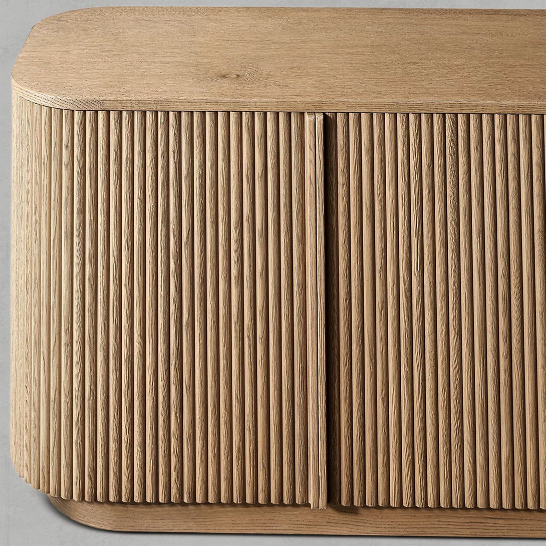 Arts & Techniques | - Crafted from kiln-dried solid wood and engineered wood with American oak veneers, this piece undergoes an intensive multistep finishing process to achieve a matte surface with a clearly visible grain. - The vertical surfaces are adorned with solid oak reeding, adding texture and depth to the sideboard’s overall design. |