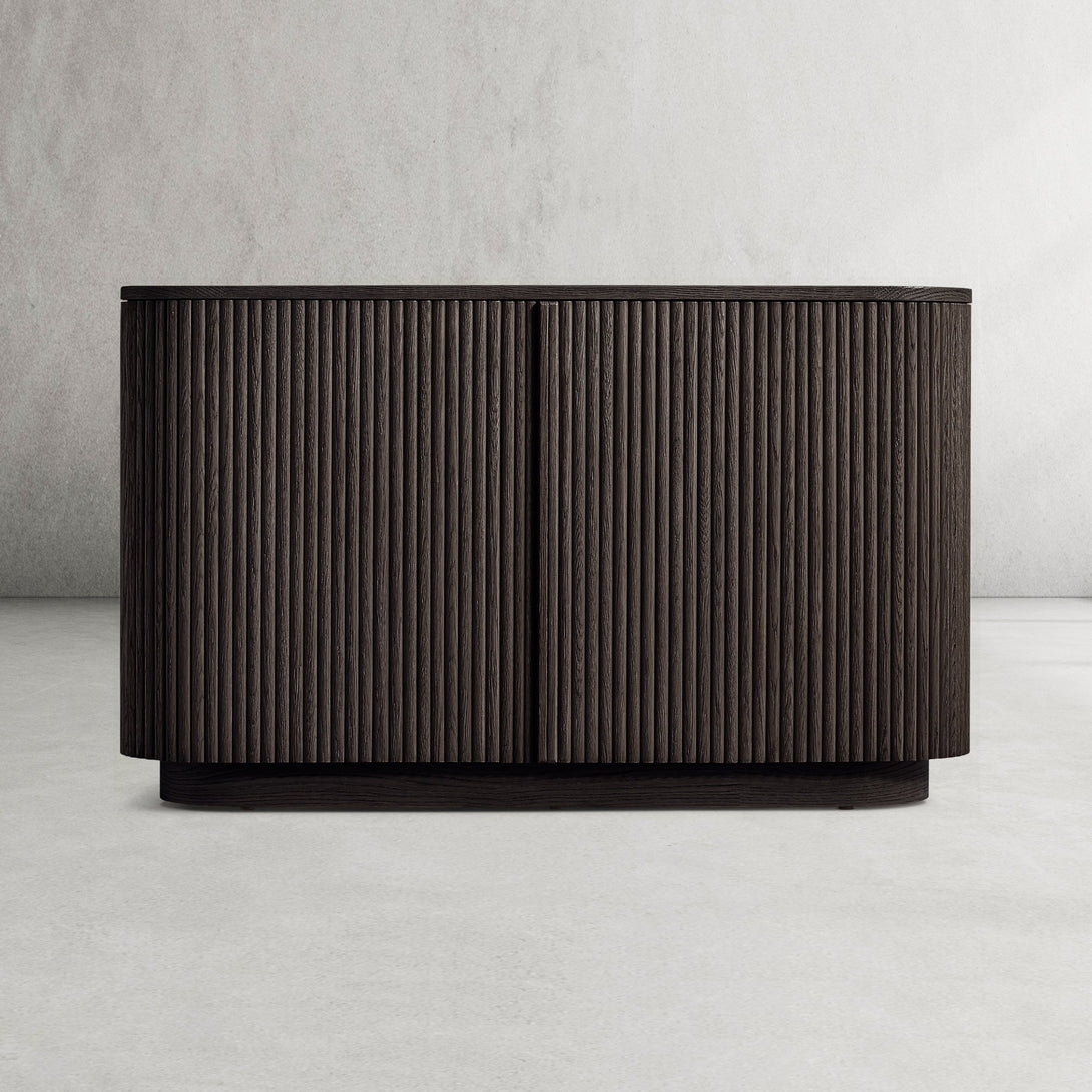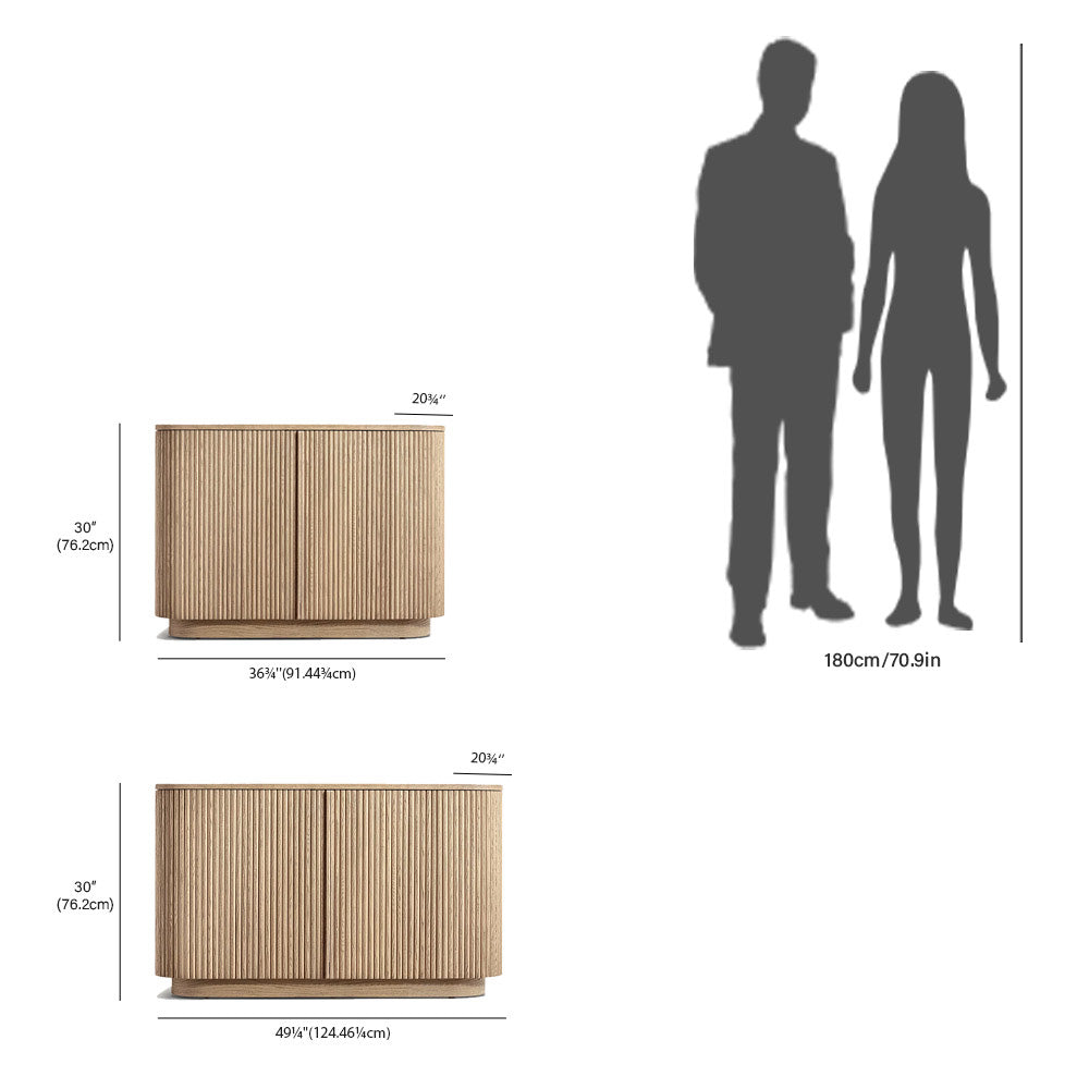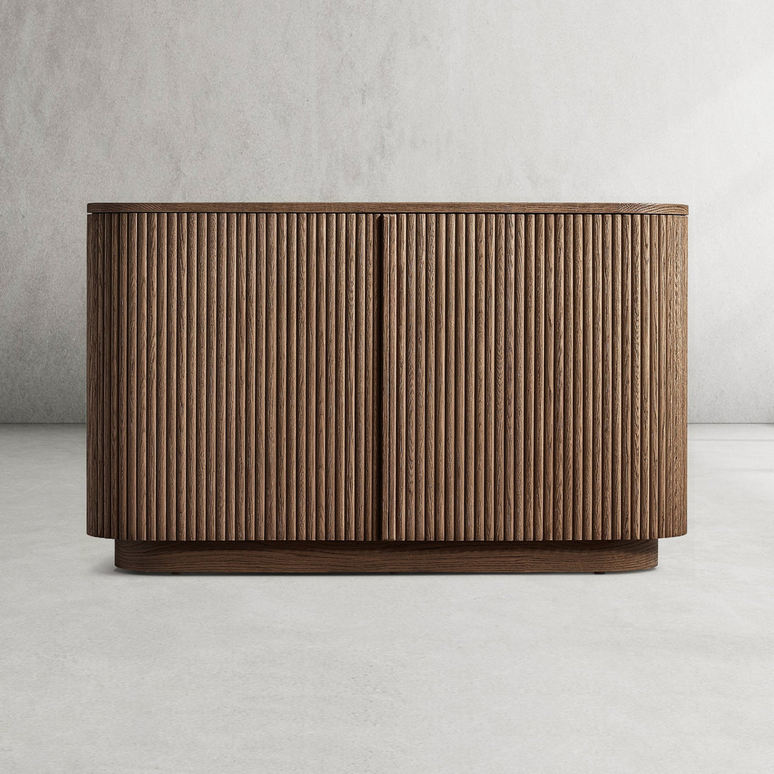 Arts & Techniques | - Crafted from kiln-dried solid wood and engineered wood with American oak veneers, this piece undergoes an intensive multistep finishing process to achieve a matte surface with a clearly visible grain. - The vertical surfaces are adorned with solid oak reeding, adding texture and depth to the sideboard’s overall design. |