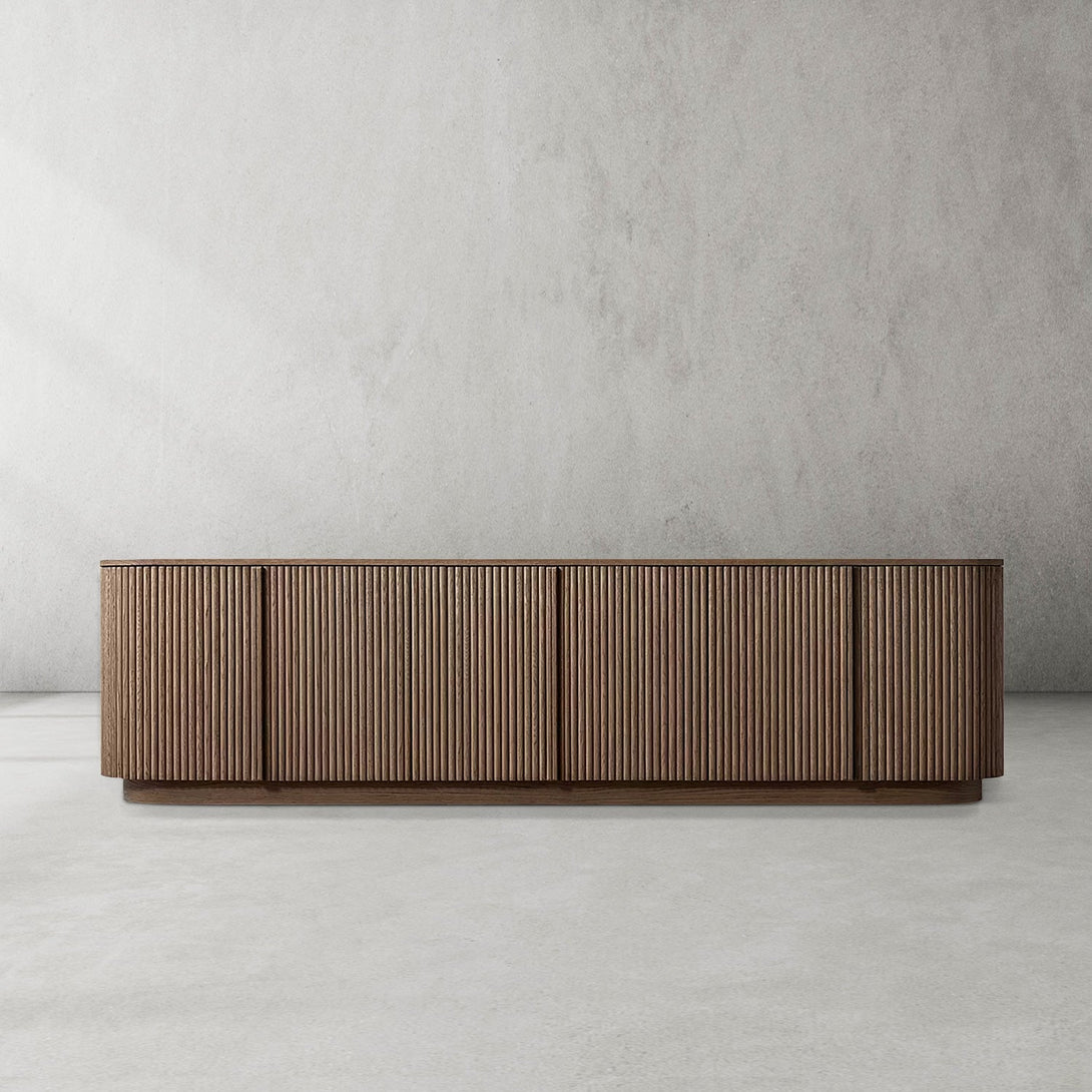 Key Features | - The Mulho Media Console features individually applied reeds of wire-brushed solid American oak, ensuring each piece is unique. - Radius corners and curved doors create a fluid silhouette that enhances the living space. |