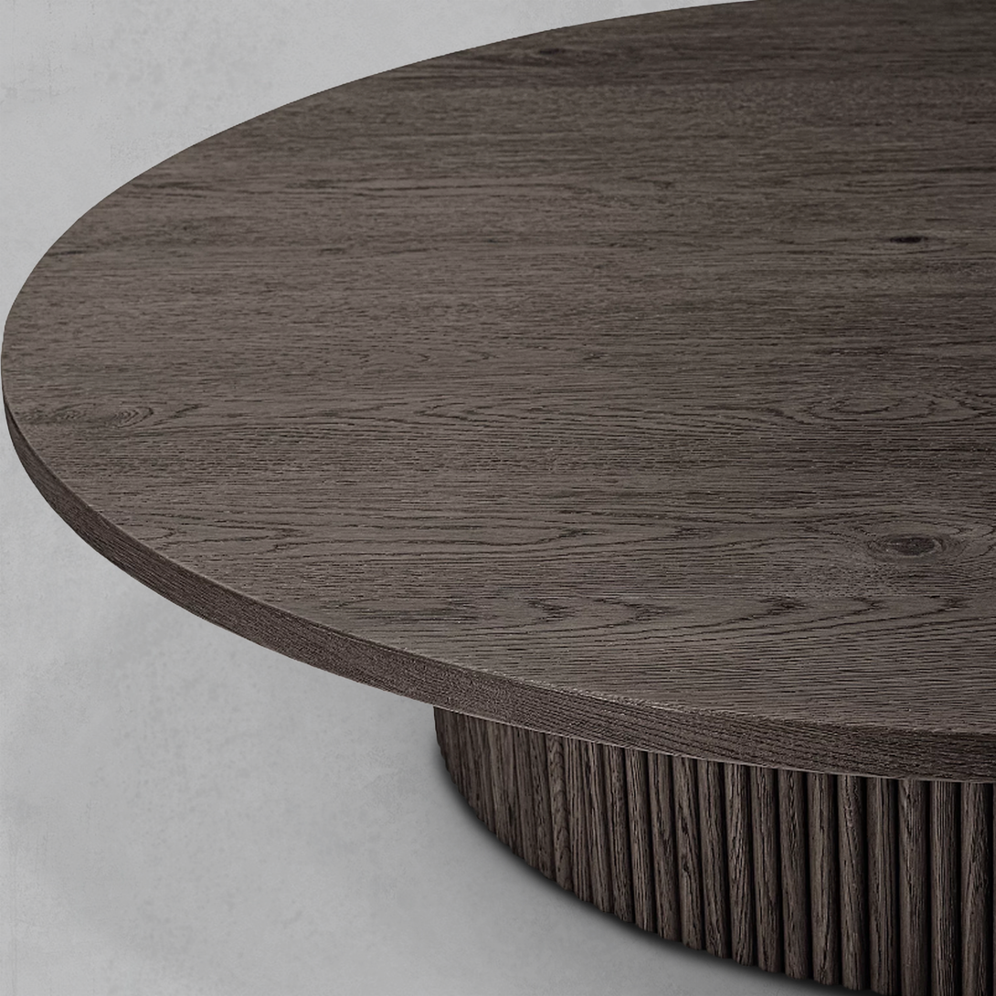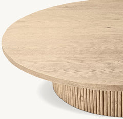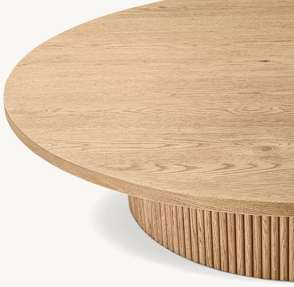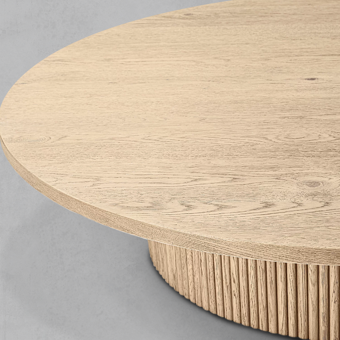CONSTRUCTION & MATERIALS | - The table is meticulously crafted from kiln-dried solid wood and engineered wood, adorned with American oak veneers, ensuring durability and a high-quality finish. - The vertical surfaces showcase solid oak reeding, adding a distinct, tactile element to the piece. - An intensive multistep finishing process gives the table a matte surface that highlights the natural grain of the wood, adding character and depth. |
