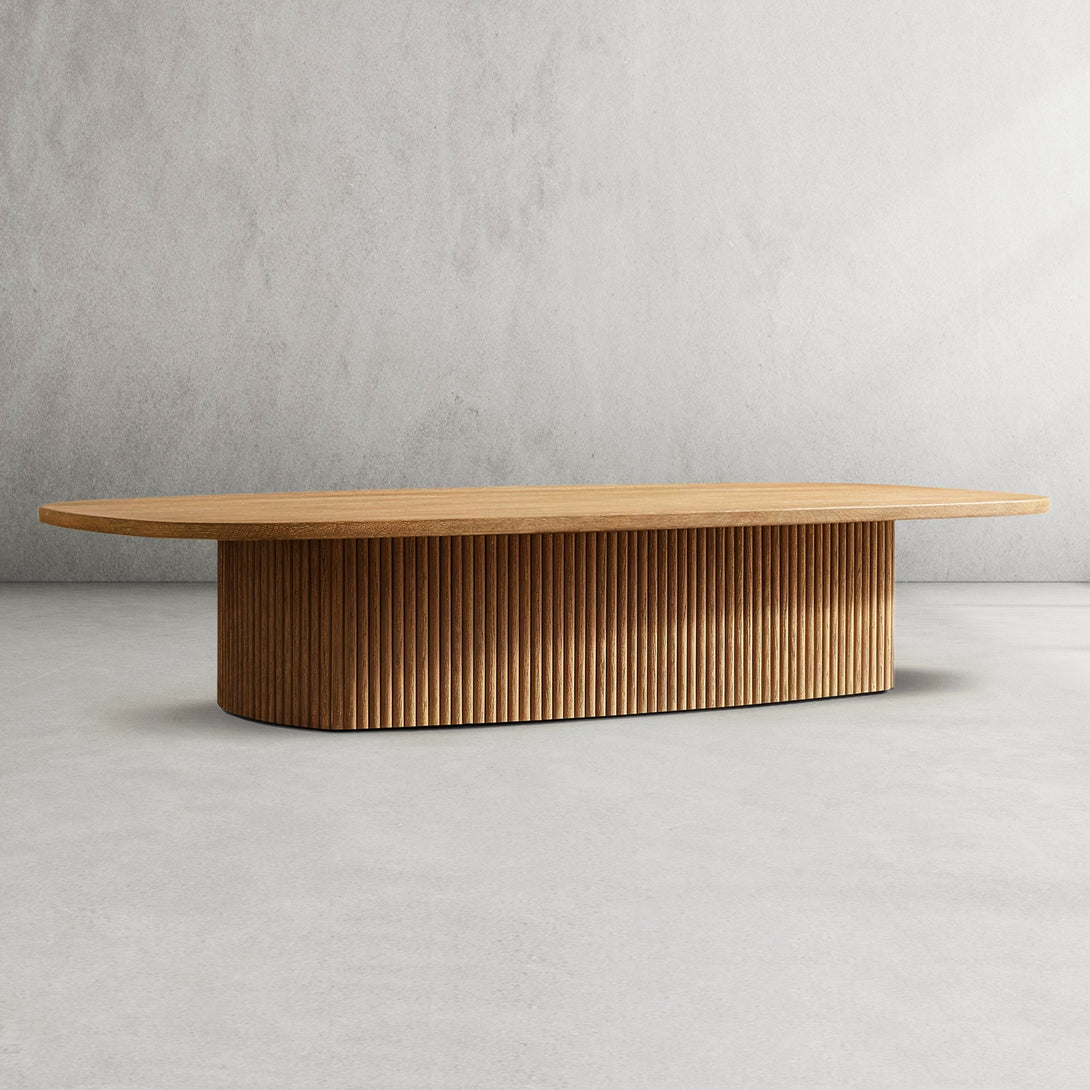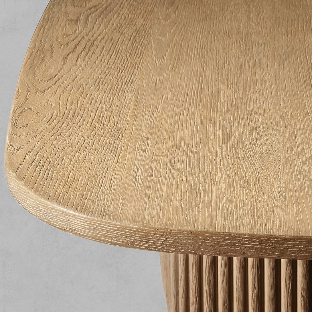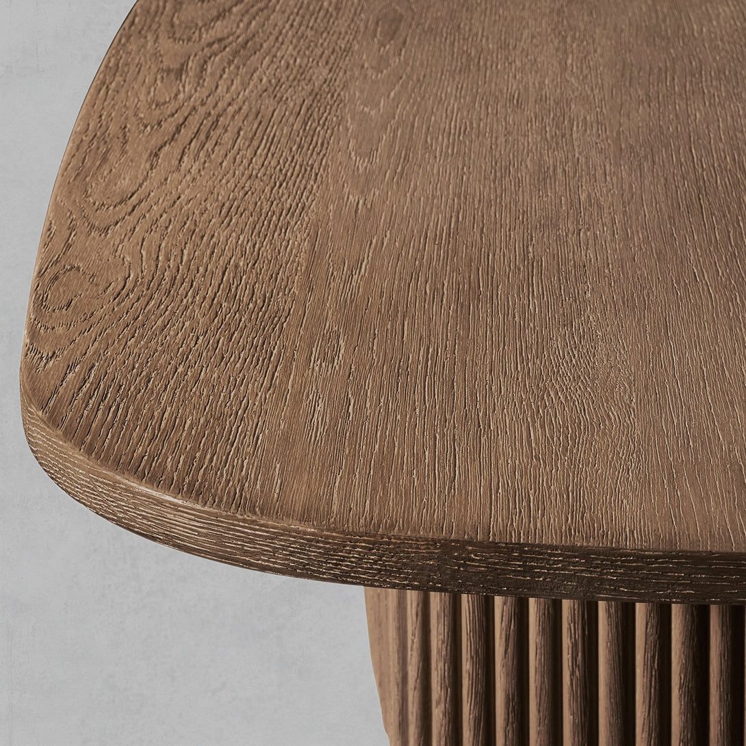 Construction & Materials | - The table is meticulously crafted from kiln-dried solid wood and engineered wood, adorned with American oak veneers, ensuring durability and a high-quality finish. - The vertical surfaces showcase solid oak reeding, adding a distinct, tactile element to the piece. - An intensive multistep finishing process gives the table a matte surface that highlights the natural grain of the wood, adding character and depth. |