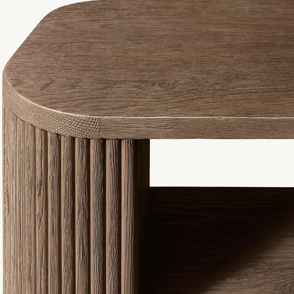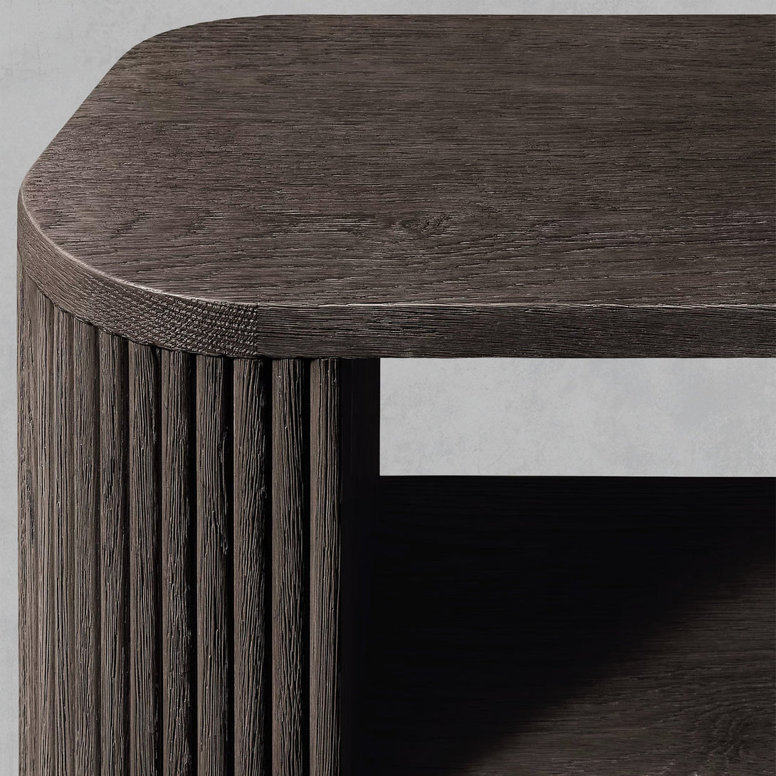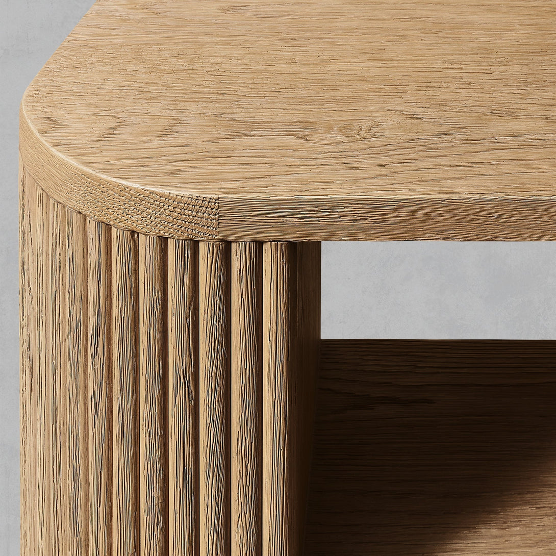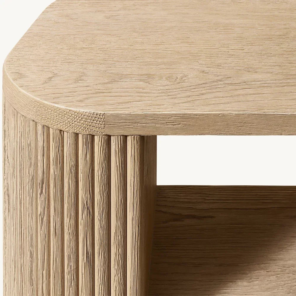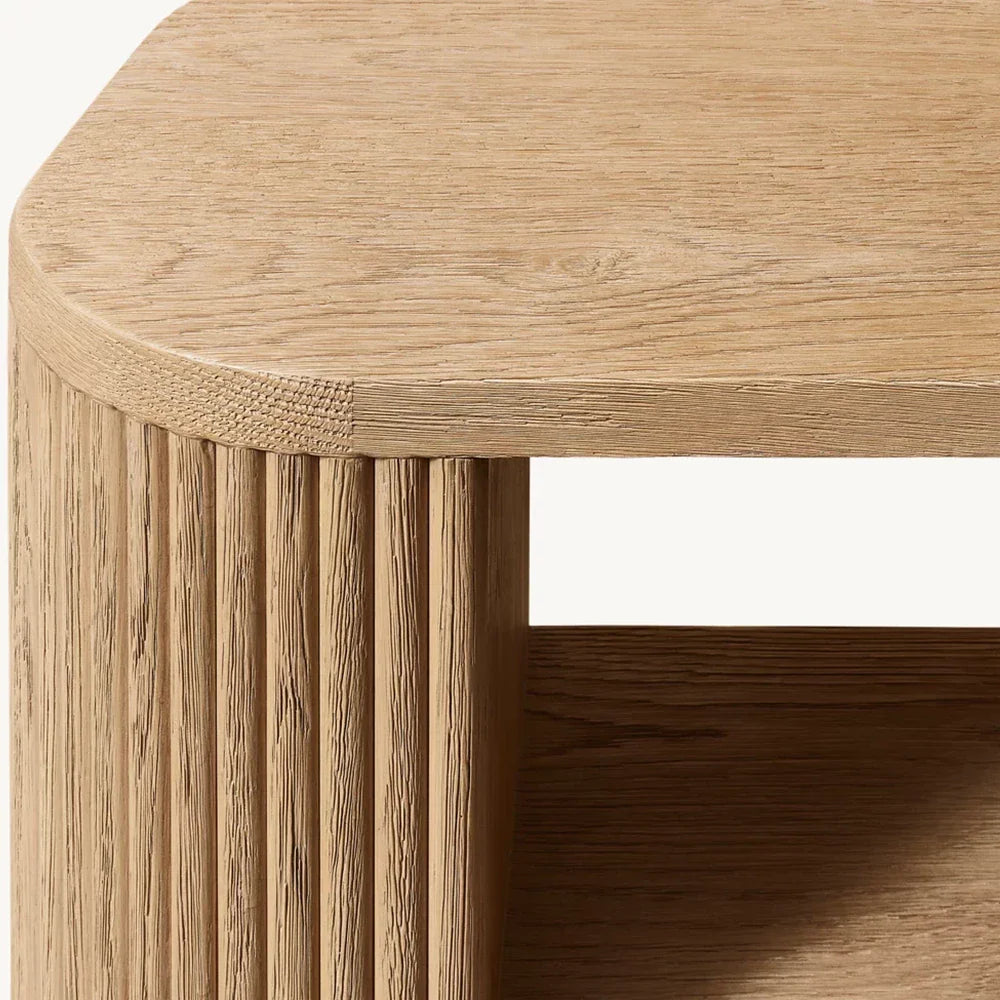 Construction & Materials | - The table is meticulously crafted from kiln-dried solid wood and engineered wood, adorned with American oak veneers, ensuring durability and a high-quality finish. - The vertical surfaces showcase solid oak reeding, adding a distinct, tactile element to the piece. - An intensive multistep finishing process gives the table a matte surface that highlights the natural grain of the wood, adding character and depth. |