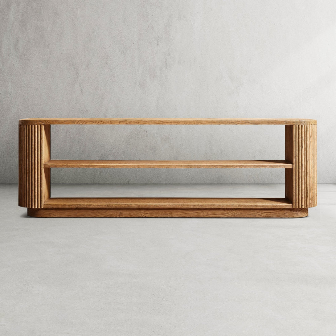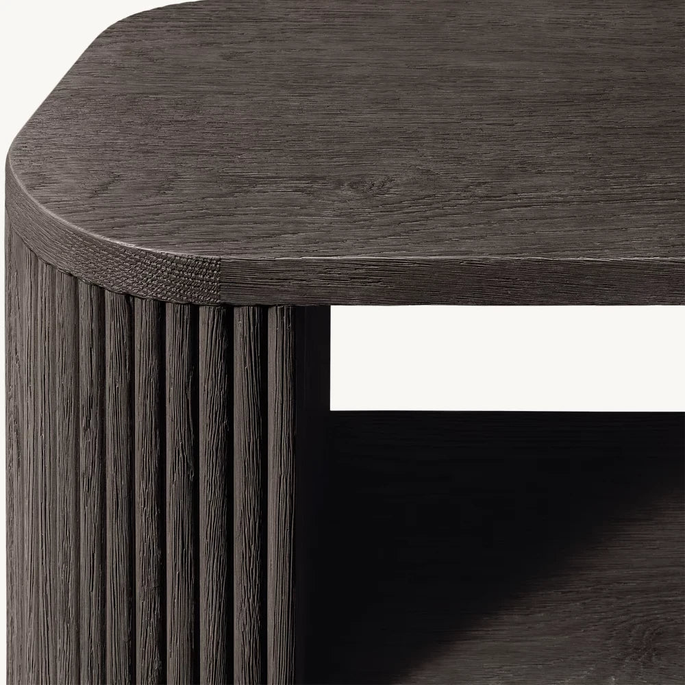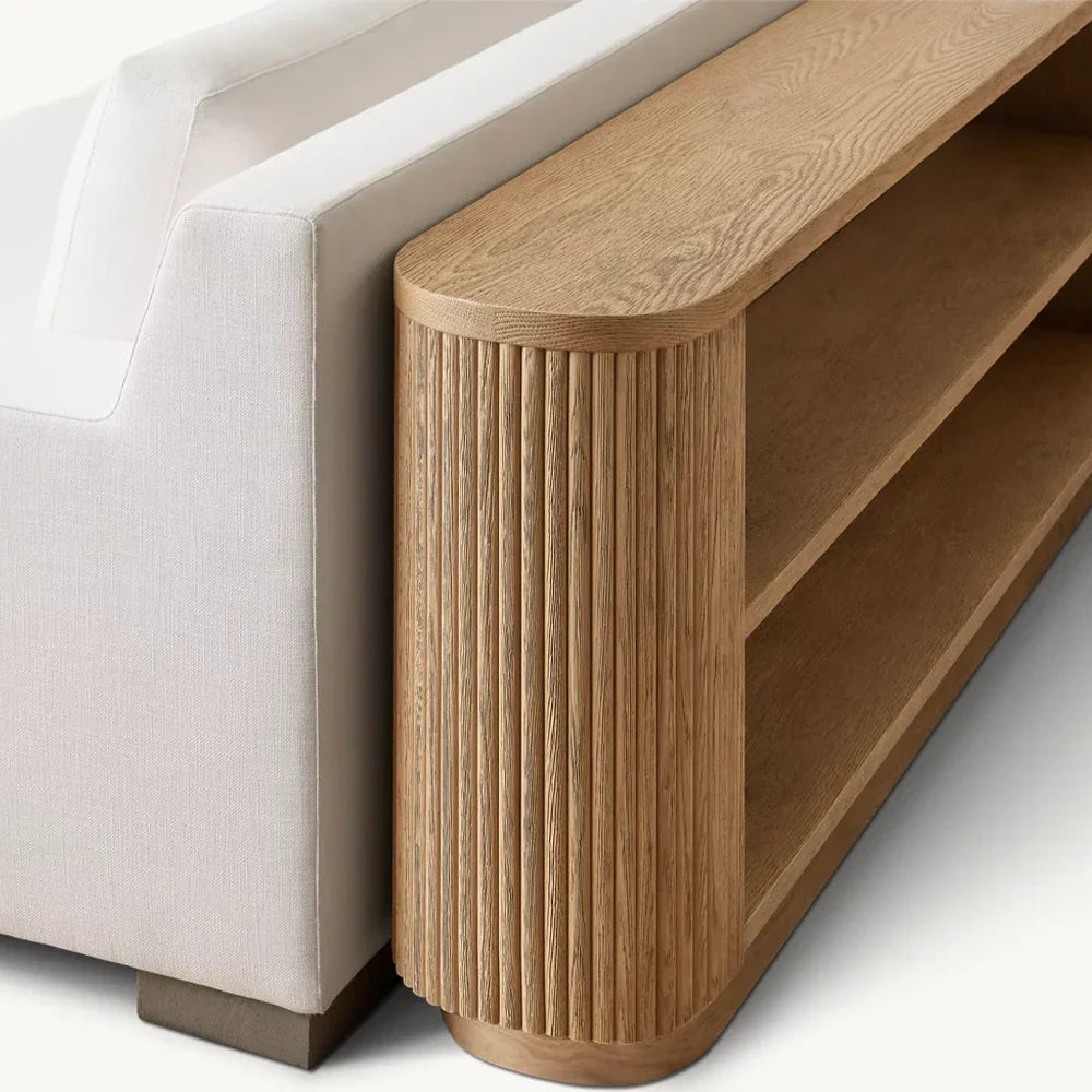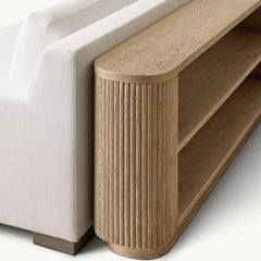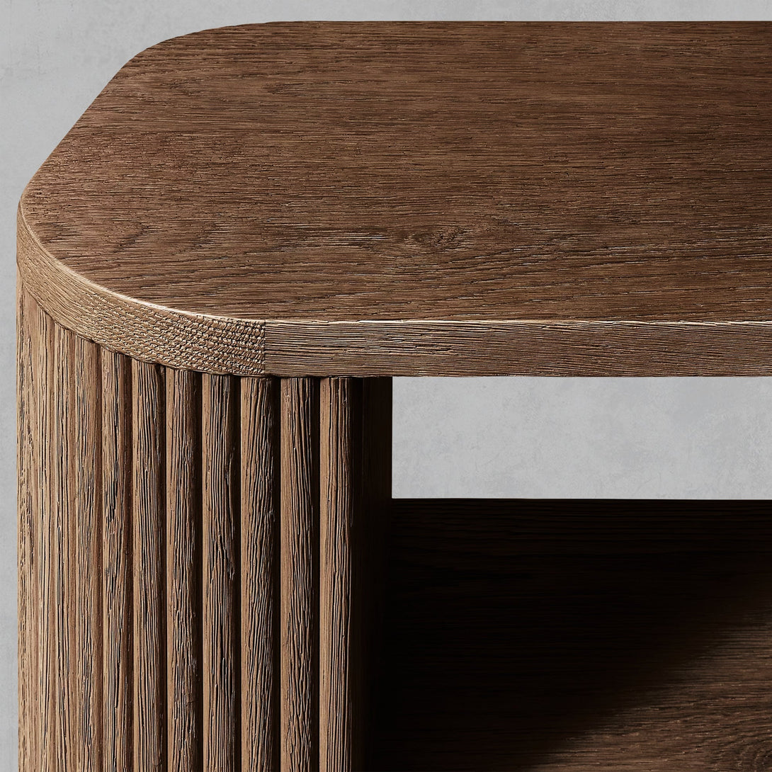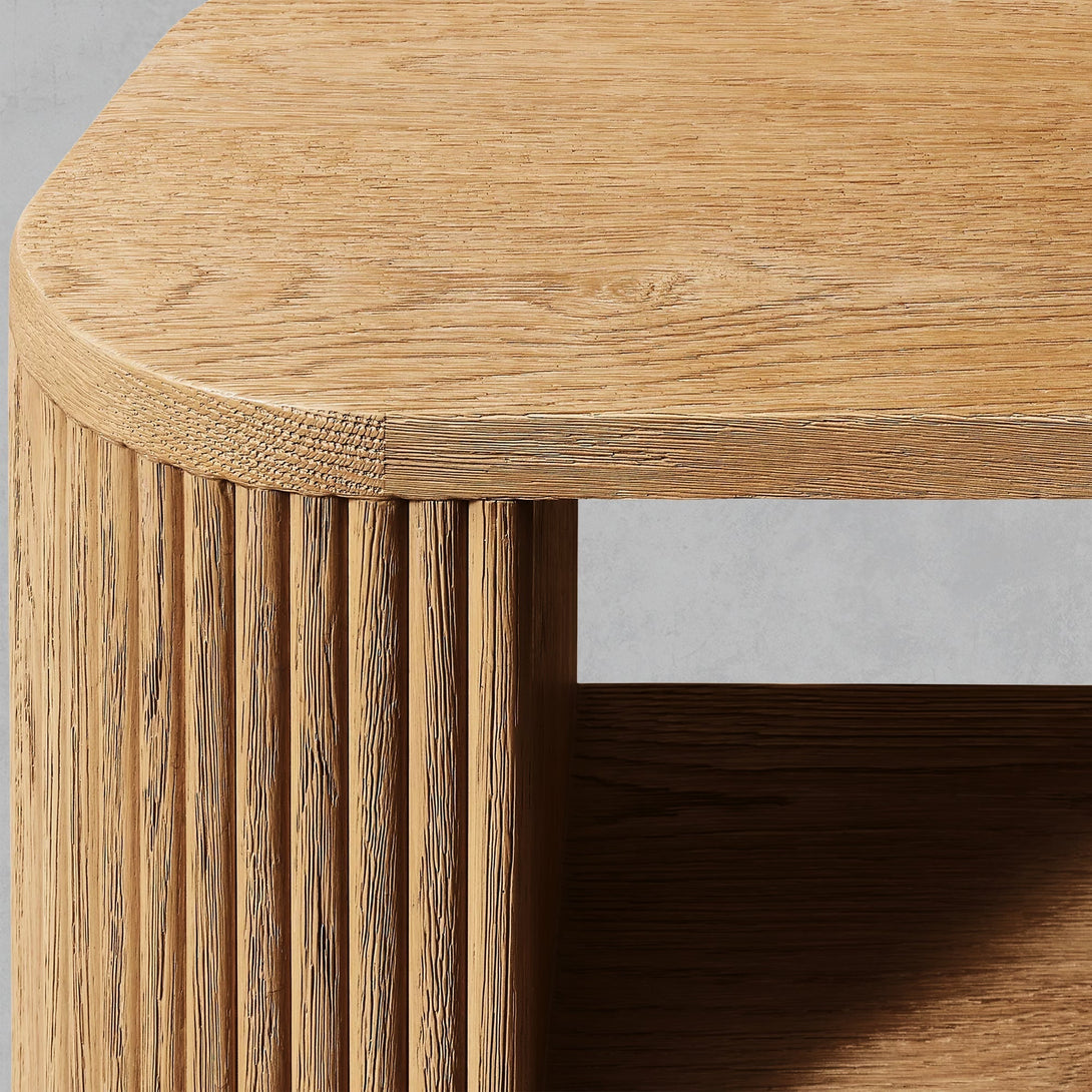 Construction & Materials | - The table is meticulously crafted from kiln-dried solid wood and engineered wood, adorned with American oak veneers, ensuring durability and a high-quality finish. - The vertical surfaces showcase solid oak reeding, adding a distinct, tactile element to the piece. - An intensive multistep finishing process gives the table a matte surface that highlights the natural grain of the wood, adding character and depth. |