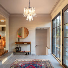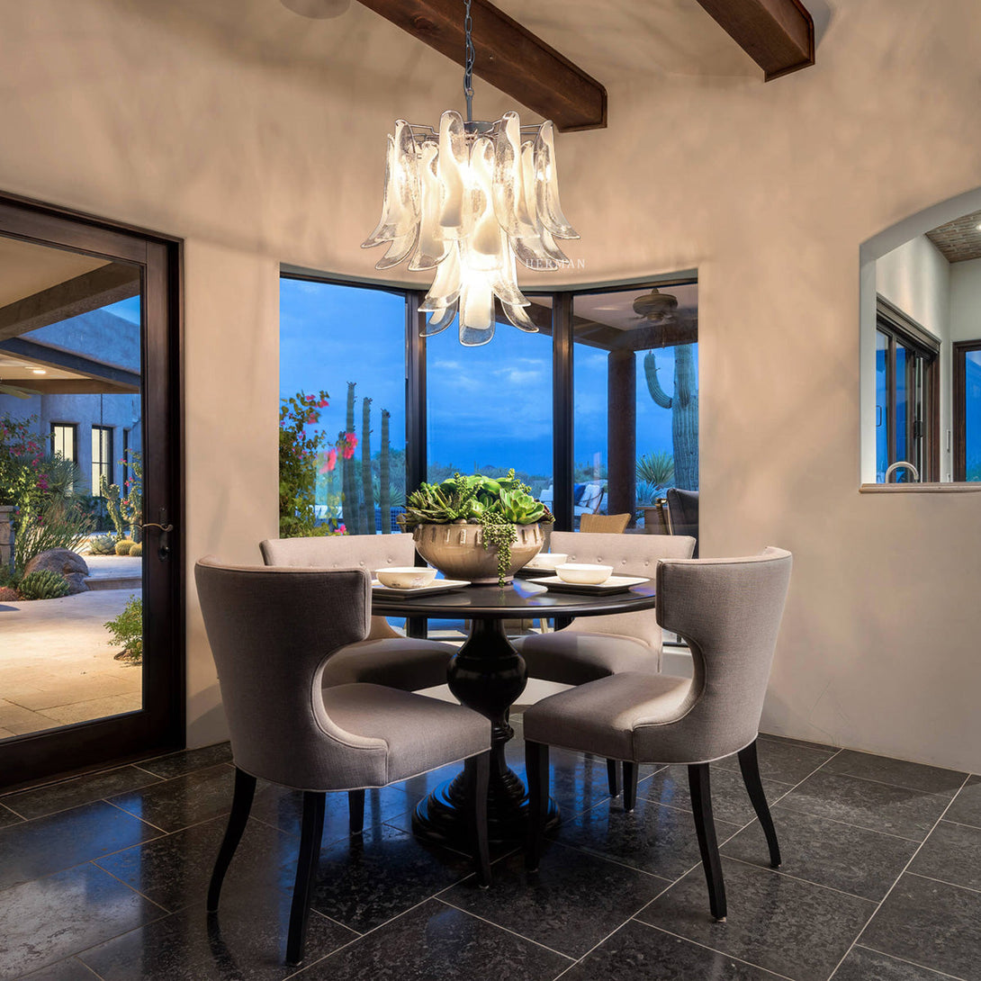 Treat your home to sublime elegance with our stunning Italian Mazzega style chandelier. This impressive chandelier is adorned with 26 large and impressive clear/white petals that create an enchanting and inviting light.