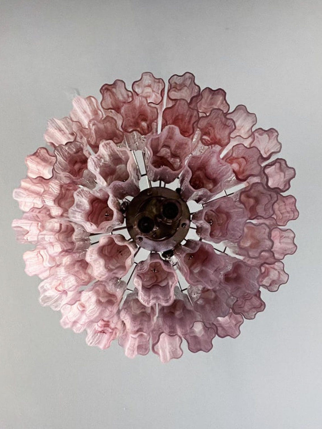 Italian chandelier with Murano glass on metal structure. The lampshade supports 48 large alabaster pink glass tubes in star shape.