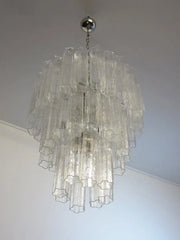 Expertly crafted in Murano, Italy, this stunning chandelier boasts 48 transparent tubes for a mesmerizing display of light. Made with the finest quality glass, this chandelier adds a touch of elegance and luxury to any space. Bring the beauty of Murano glass into your home with this exquisite piece.