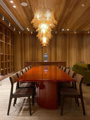 Add a touch of elegance to any room with our Murano Chandelier. Made with 52 hand-crafted glass leaves in a soft pink hue, this exquisite piece is sure to impress. Perfect for creating a romantic atmosphere or adding a pop of color to your space. Bring luxury and charm to your home with our Murano Chandelier.