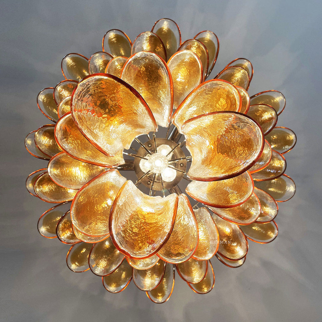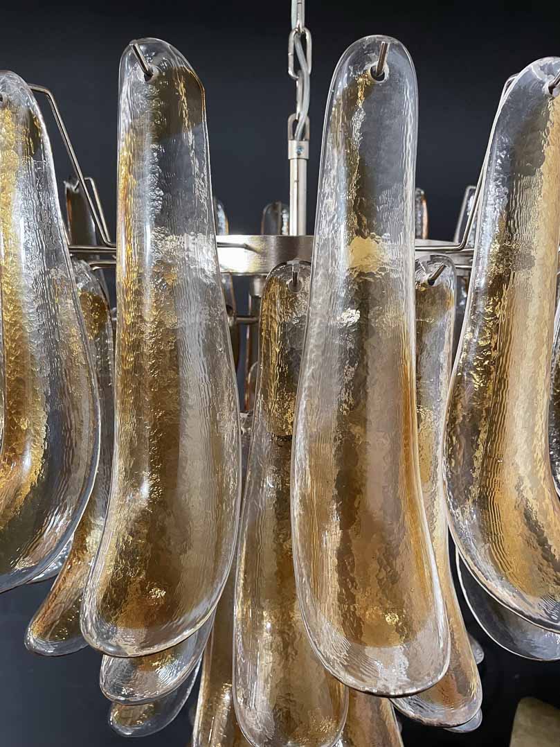 Treat your home to a unique elegance with our large and super beautiful Italian Murano chandelier in Mazzega style. This impressive chandelier is made from 52 large amber petals that are beautifully framed in a chrome frame.