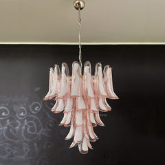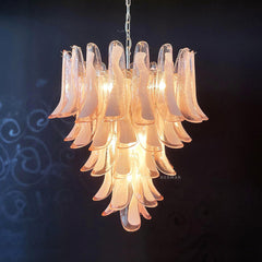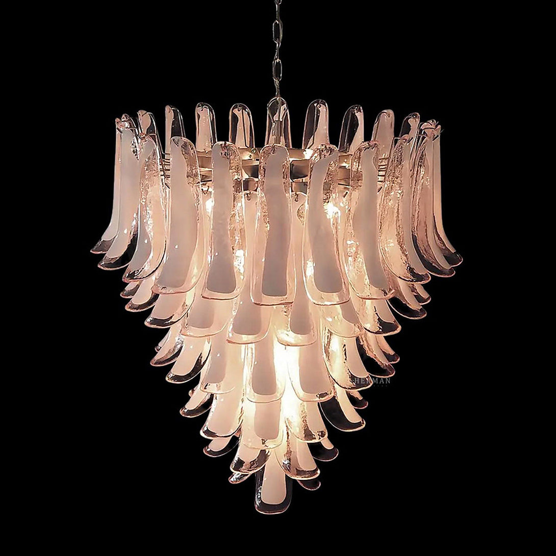 The lamp is composed of 52 large, hand-blown glass pendant petals in pink and white glass, creating an enchanting contrast and adding a touch of glamor to any room. The abstract shapes on the glasses add a subtle artistic dimension to the chandelier that catches the eye and creates a beautiful light.
