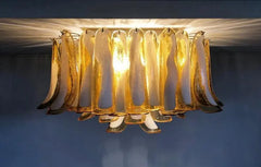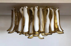 Expertly handcrafted in Murano, Italy, this stunning chandelier boasts 64 intricate petals in a warm caramel hue. The perfect combination of art and functionality, this chandelier will elevate any space with its elegant and unique design. Achieve a touch of timeless luxury with this Murano masterpiece.