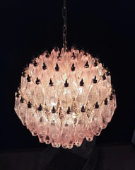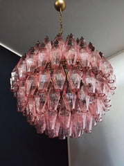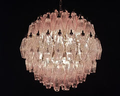 Expertly crafted in Murano, Italy, this chandelier boasts 140 polished glass poliedri pieces in a beautiful pink hue. With its intricate design and stunning color, it adds a touch of elegance and sophistication to any space. Handmade by skilled artisans, it is a true masterpiece of Venetian glassmaking.