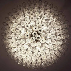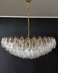 Expertly crafted in Murano, Italy, this stunning chandelier features 75 transparent glasses beautifully arranged in a captivating drop design. Elevate any space with its timeless elegance and the exceptional quality of each hand-blown glass piece. Add a touch of luxury to your home with this Murano masterpiece.