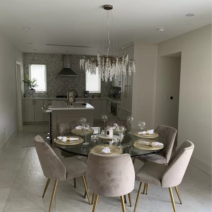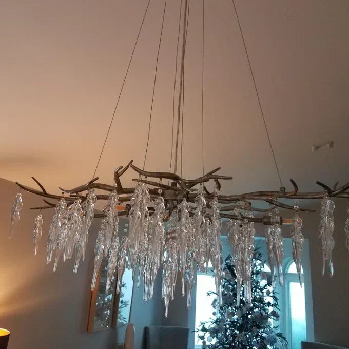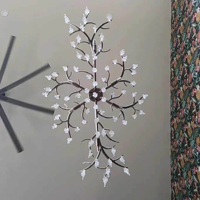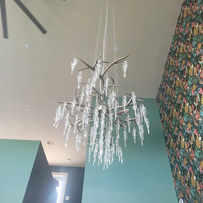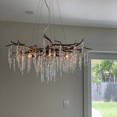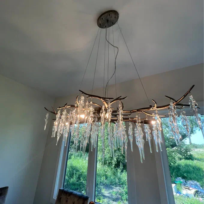 With its striking blend of elegant and rustic vibes, this chandelier makes a statement wherever it hangs. Crafted from metal, the branch-like structure is finished in a warm bronze hue with speckled silver undertones throughout. This fixture shows off icicle glass strands topped with crystal beads for a glistening display of light. We love the intentional distressing throughout, which leans into this piece's old world charm. Best of all, it boasts an adjustable height and is compatible with both sloped ceilings and dimmer switches. Bulbs are included to save you a trip to the hardware store.