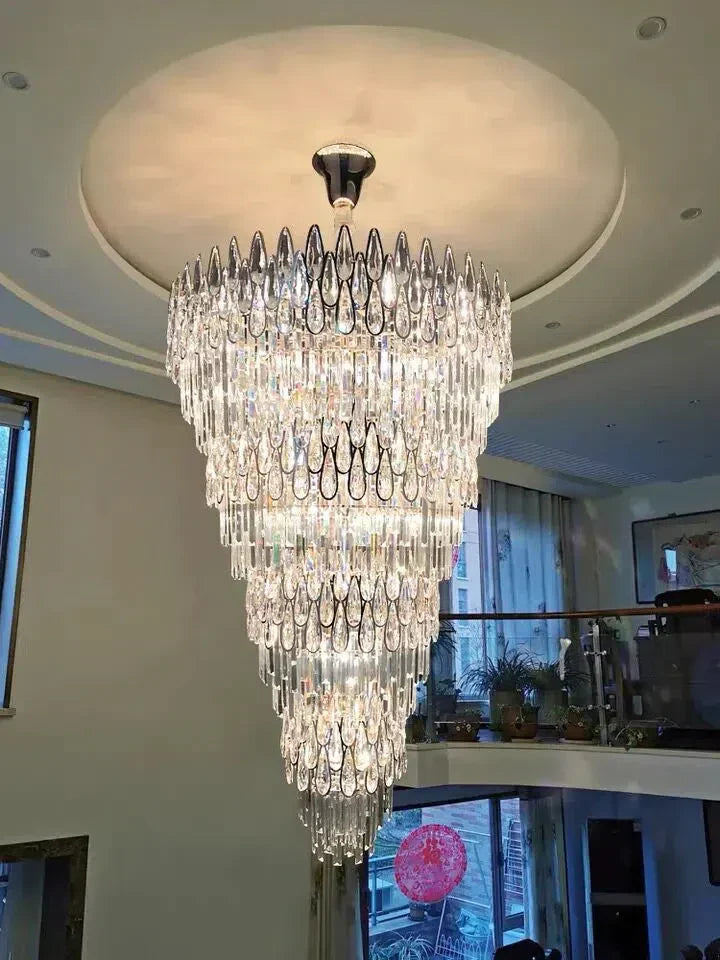 The look of this oversized post-modern luxury crystal chandelier is spectacular and stunning, with raindrop-shaped crystal patches with clear crystal strips that have a layered feel while enhancing the viewability of this chandelier, this chandelier can be used for home decor or commercial decoration to create a luxurious and textured atmosphere that will impress your guests!