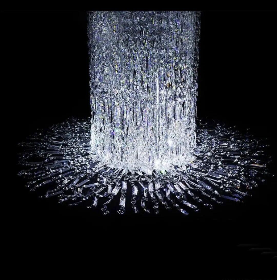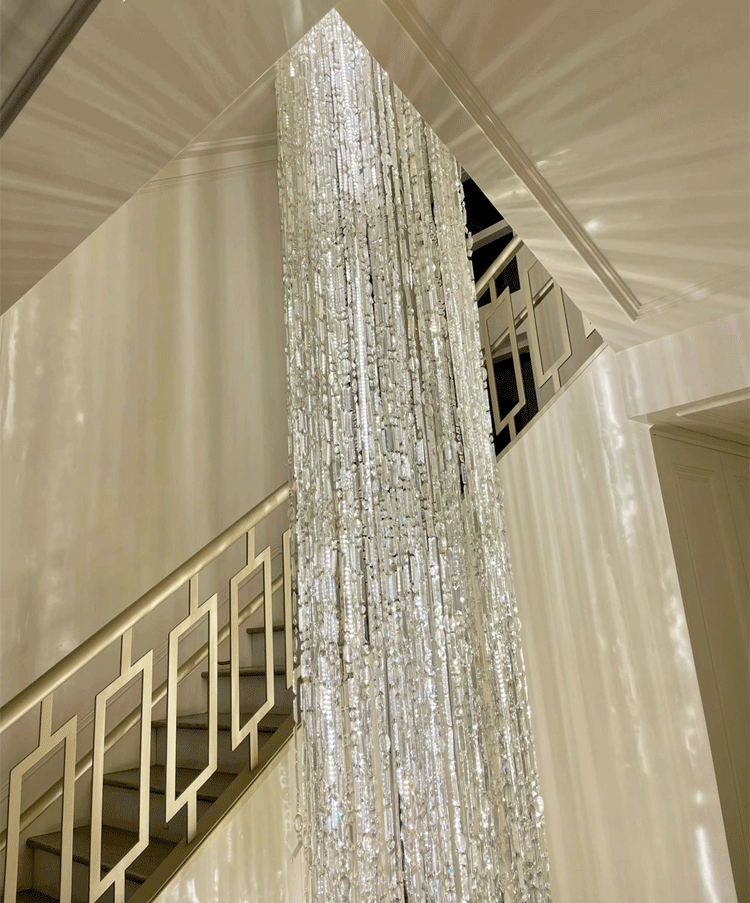 It's like a waterfall cascading down, with dazzling crystals shimmering silver and pouring down from the ceiling. This Icicle Crystal Chandelier is a stunning work of art custom made for the staircase and is absolutely the most unparalleled in its beauty.