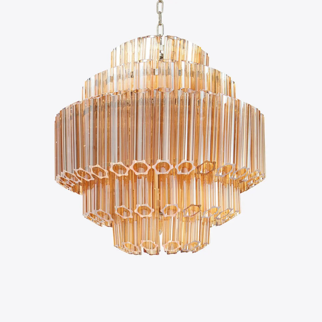 The stunning 1970s-inspired glass Palermo Chandelier features a chrome-plated iron frame, with hexagonal glass tubes elegantly suspended at each level in a diamond formation.