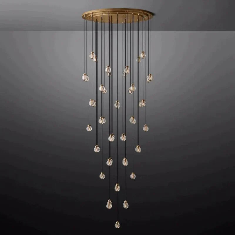 Each crystal glass ball is carved by skilled artisans, and the ceiling shade and fittings are made of solid brass. The glass shade of this chandelier is sculpted with intricate grooves like a pearl crafted by nature, adding a touch of lustre and sea to this wall lamp.