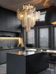 This chandelier has a stainless steel frame that is crafted for elegance from top to bottom. A long cluster of steel chains resembles a progressive waterfall with ethereal tones. The frame is cloud-like and full of curves. The colors, including silver and gold, highlight the design's sophisticated personality and stylish presence. This look offers a unique dazzle and shine that is suitable for a variety of rooms with high ceilings, from staircases to dining rooms, and commercial areas as well. This chandelier is absolutely stunning whether the lights are on or off.