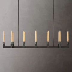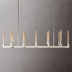 The collection chandelier is reinterpreted in brass and defined by clean lines and sharp angles, the fixture's elegant ribbed-glass hurricanes showcase Edison filament bulbs, shimmering like candles within.