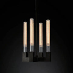 The collection chandelier is reinterpreted in brass and defined by clean lines and sharp angles, the fixture's elegant ribbed-glass hurricanes showcase Edison filament bulbs, shimmering like candles within.
