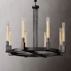 The collection chandelier is reinterpreted in brass and defined by clean lines and sharp angles, the fixture's elegant ribbed-glass hurricanes showcase Edison filament bulbs, shimmering like candles within.