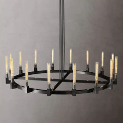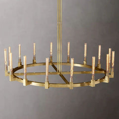 The collection chandelier is reinterpreted in brass and defined by clean lines and sharp angles, the fixture's elegant ribbed-glass hurricanes showcase Edison filament bulbs, shimmering like candles within.