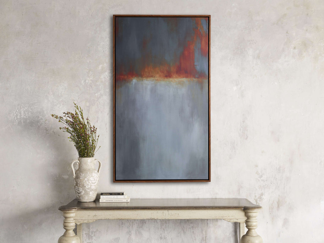- Illuminating burnt orange and cool gray tones intersect in an abstract expression of firelight in Protracted by artist Giselle Kelly. Info about artist here Need This if Available.